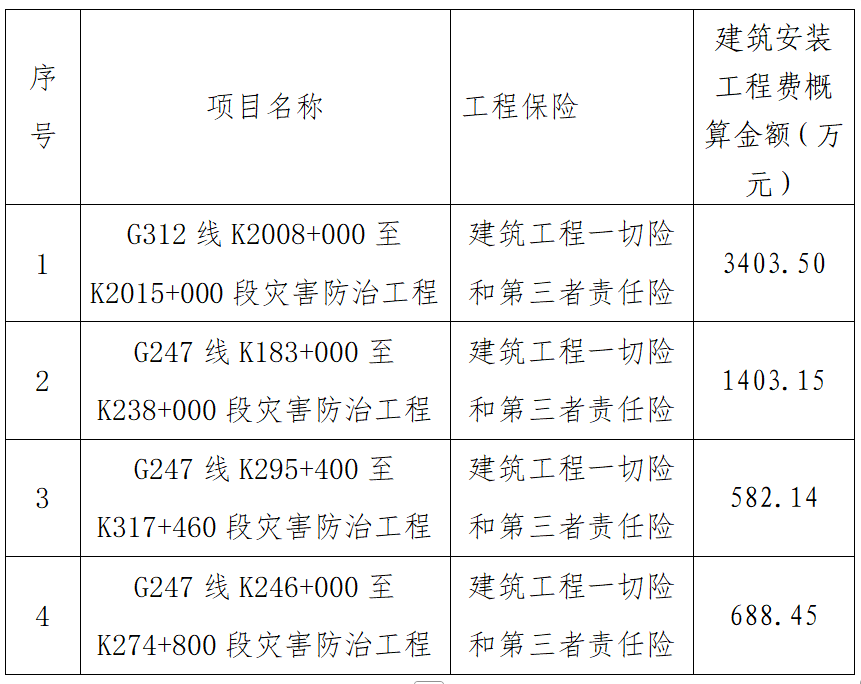 本次招标为上述4个灾害防治工程建筑工程一切险和第三者责任险统一打包招标,具体如下: